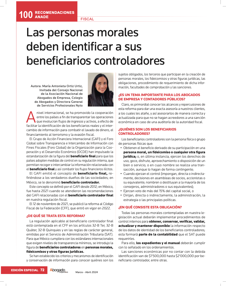 Las personas morales deben identificar a sus beneficiarios controladores Autora: María Antonieta Ortiz Urtiz, Invitada del Consejo Nacional de la Asociación Nacional de Abogados de Empresa, Colegio de Abogados y Directora General de Servicios Profesionales Nyto. A nivel internacional, se ha promovido la cooperación entre los países a fin de transparentar las operaciones que involucran flujos de ingresos y activos, a efecto de [...]